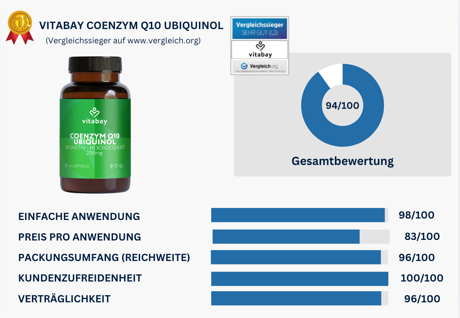 Das Vitabay Coenzym Q10 Ubiquinol-Präparat ist Testsieger in unserem Vergleich. Es überzeugt durch exzellente Bioverfügbarkeit, hohe Reinheit und Qualität der Inhaltsstoffe sowie eine effektive Unterstützung der Zellenergie.