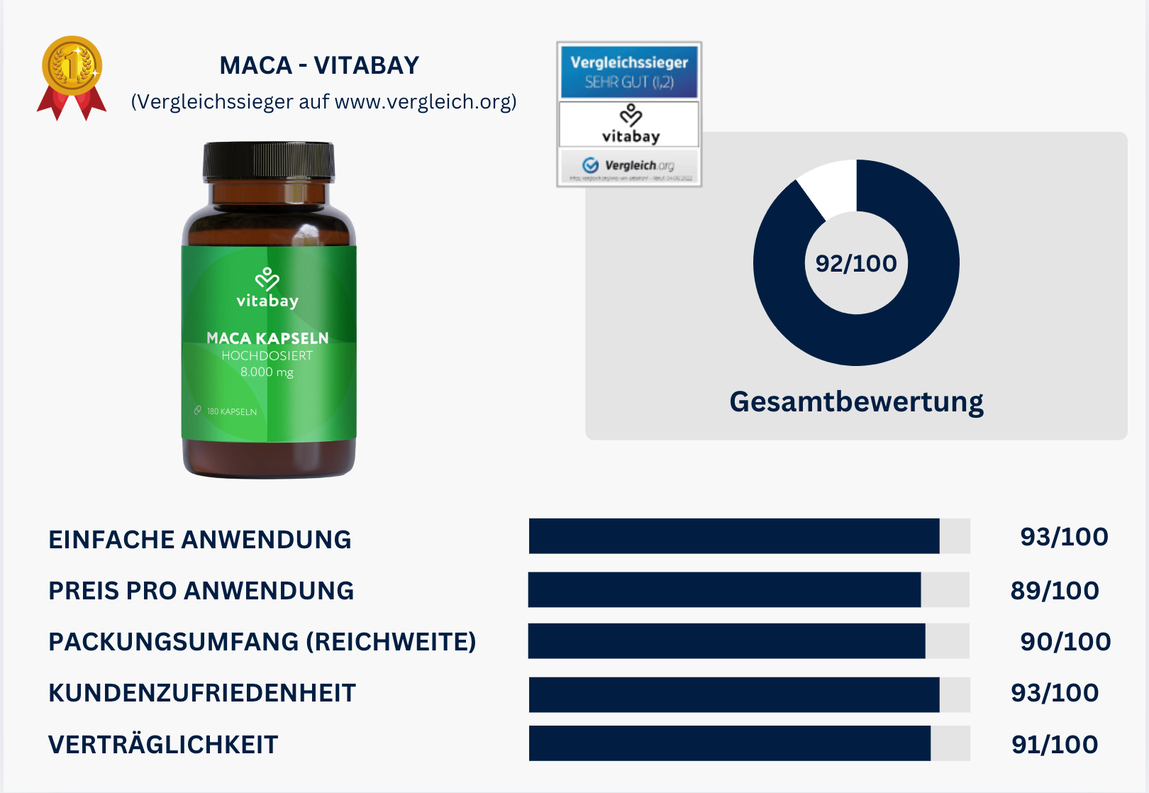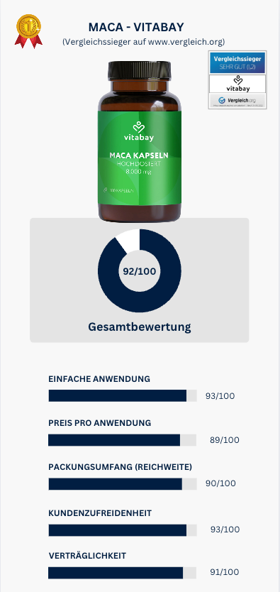 Das Vitabay MACA-Präparat ist Testsieger in unserem Vergleich. Es überzeugt durch exzellente Bioverfügbarkeit, hohe Reinheit und Qualität der Inhaltsstoffe sowie eine effektive Unterstützung der Zellenergie.