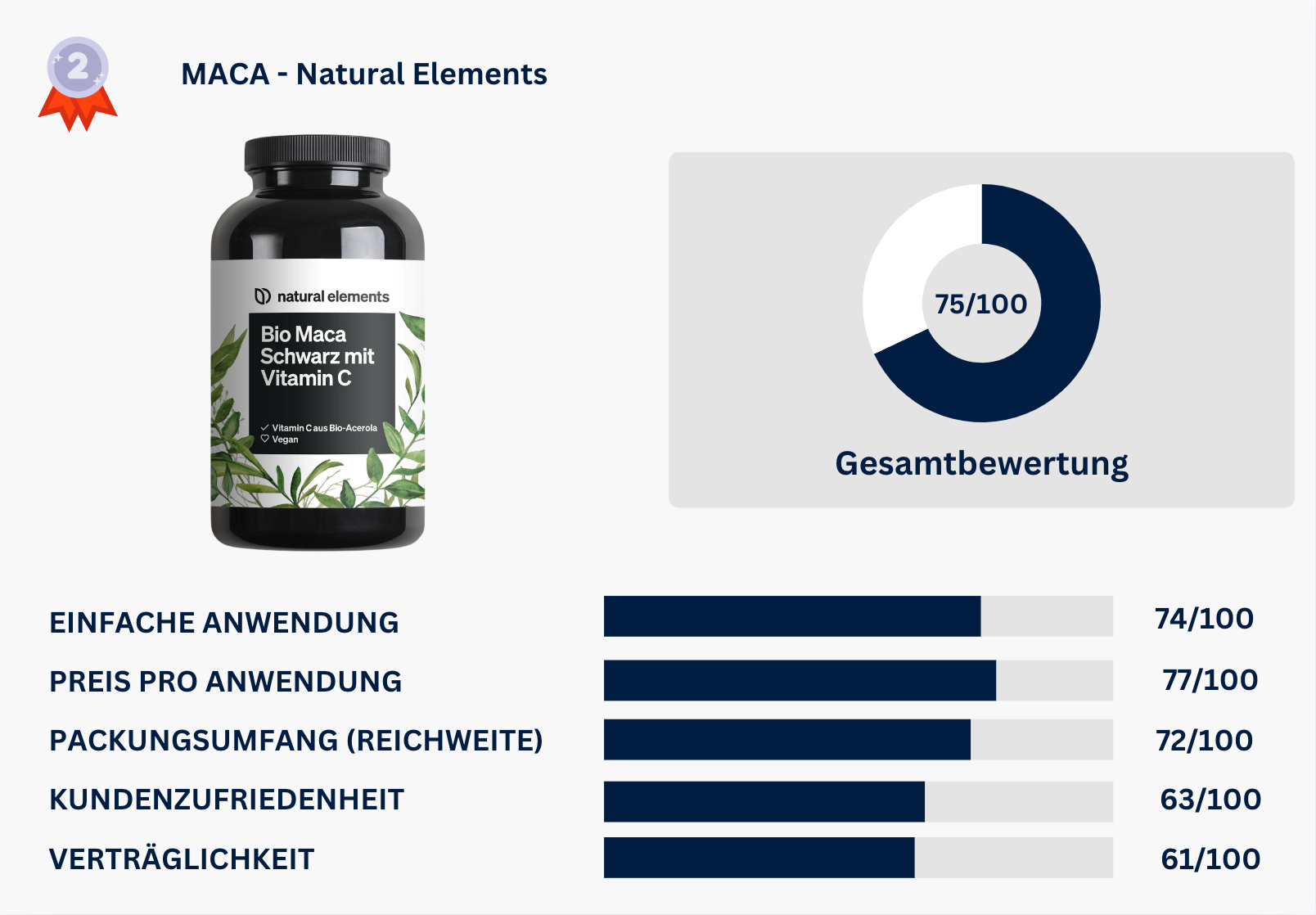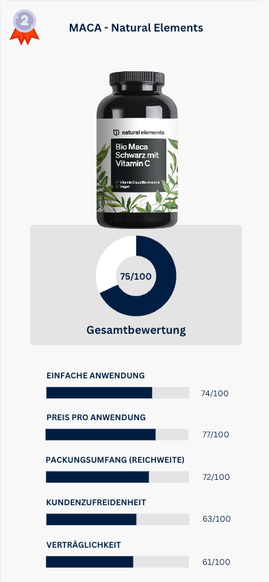 Die Maca Kapseln von Natural Elements bieten schwarzes Maca-Pulver in Bio-Qualität kombiniert mit Vitamin C aus Bio-Acerola. Eine Packung enthält 180 vegane Kapseln, ausreichend für 45 Tage bei der empfohlenen Dosierung von 4 Kapseln täglich. Jede Tagesdosis liefert 3.000 mg Maca und 13 mg Vitamin C. Der Preis liegt bei 17,49 € pro Packung.
