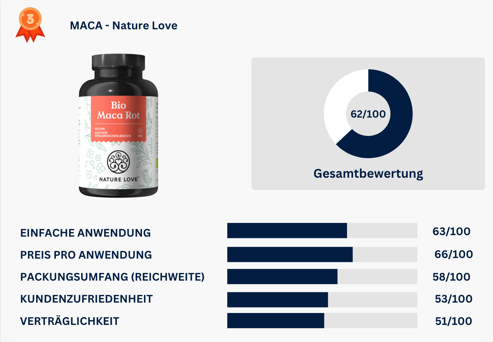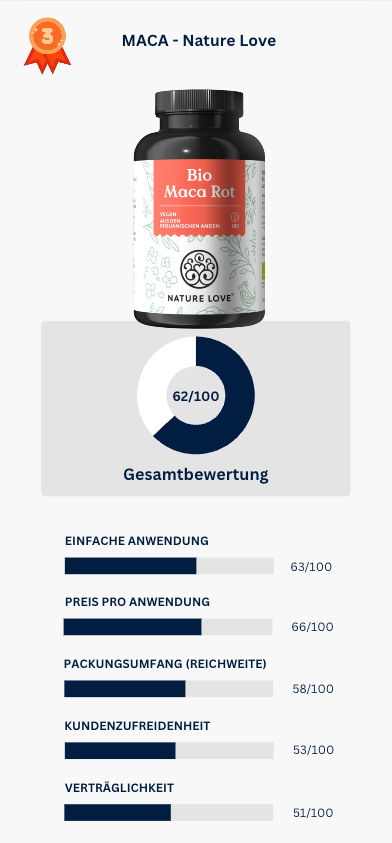 Die Maca Kapseln von Nature Love enthalten 3.000 mg Bio-Maca-Pulver aus Peru pro Tagesdosis (4 Kapseln), ergänzt mit natürlichem Vitamin C aus Acerola. Eine Packung umfasst 180 Kapseln. Der aktuelle Preis liegt bei 16,09 €.