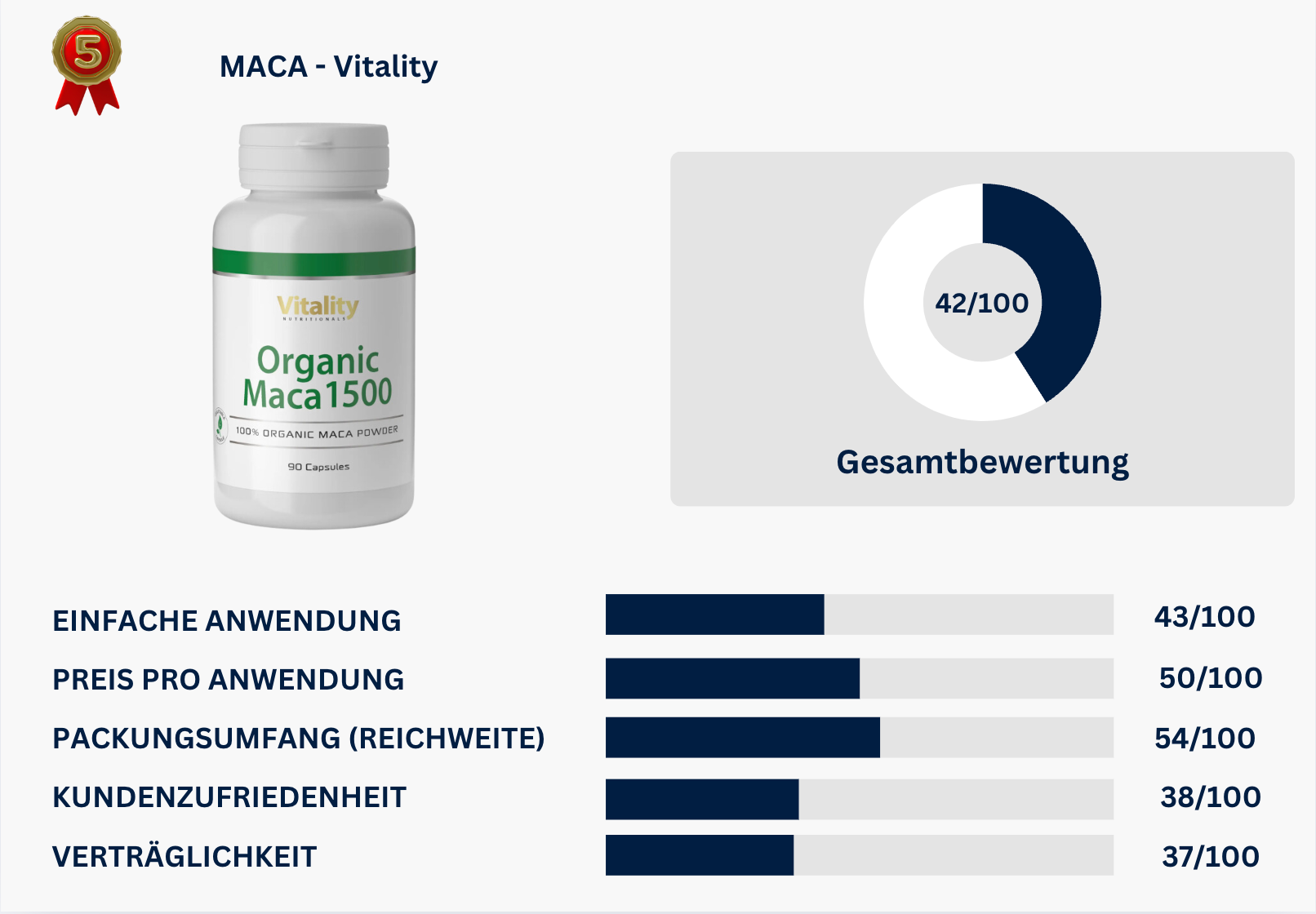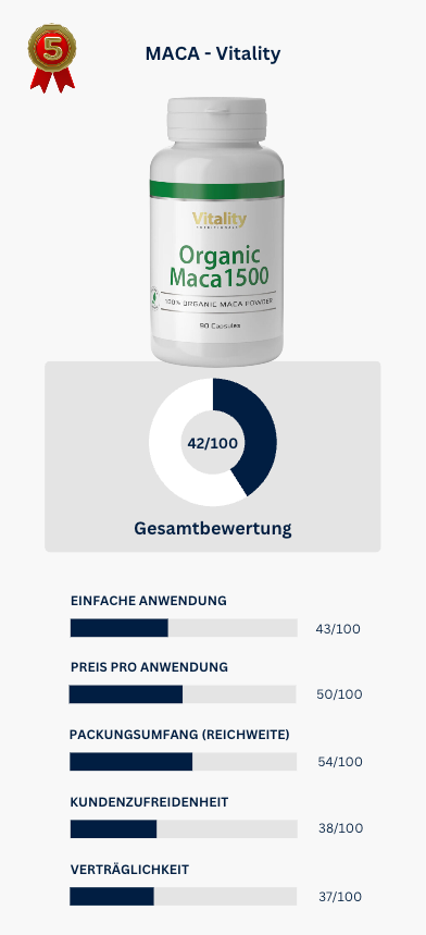 Die Maca Kapseln von Vitality enthalten 90 Kapseln mit jeweils 500 mg Maca-Pulver in Bio-Qualität und kostet 12,99 €. Die empfohlene Dosierung beträgt drei Kapseln täglich, ausreichend für einen Monat. Das Produkt ist vegan, gluten- und laktosefrei.