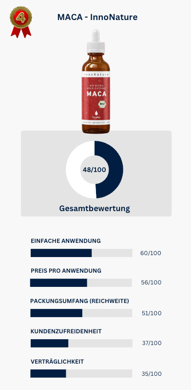 Das Bio rote Maca-Extrakt von InnoNature ist ein veganes Nahrungsergänzungsmittel, speziell für Frauen, in einer 75-ml-Flasche für 28,11 €. Die empfohlene Dosierung beträgt 2-mal täglich 20 Tropfen, wodurch eine Flasche etwa 25 Tage reicht. Hergestellt aus peruanischer roter Maca-Wurzel, wird es als natürliches Produkt für das Wohlbefinden beworben.